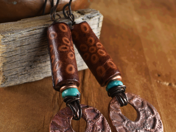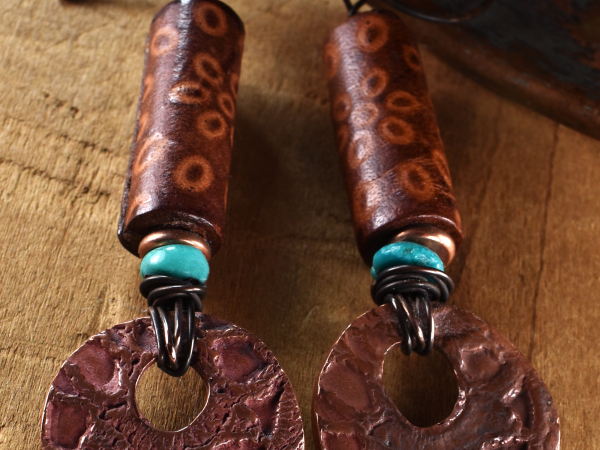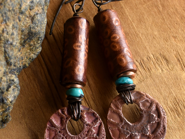 Copper Leather Turquoise Southwestern Earrings: Artisan Metal Clay Carved Tubes